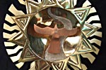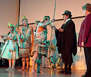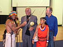 Vicente Shiguango entrega la lanza de la Autoridad Suprema al Dr. Luis Macas, Presidente Honorario del Comite Organizador de la Bienal. Octubre 12, 2006