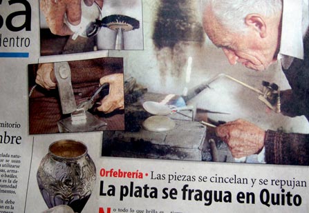 Sus trabajos han sobrepasado las fronteras…. Como en el País existen 40 Embajadas, Don Jorge ha elaborado al menos un adorno para cada una de ellas. Nació en el barrio más popular de Quito, La Tola. Su Abuela fue una de las fundadoras, alló nacieron su madre y sus hijos. Se caso con Laura Chamorro hace 54 años…” |