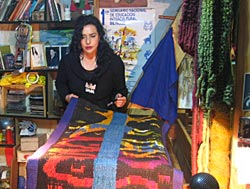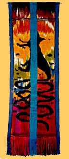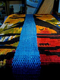En este caso es un segmento de faja, sacado de su contexto de funcionalidad para trasladarla a un formato de Tapiz mural a gran escala. Utiliza materiales no tradicionales: algodón y cáñamo y sitúa al personaje de leyenda en un espacio propio y particular.