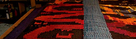 Utiliza materiales no tradicionales: algodón (urdimbre) y cáñamo (trama), de un grosor considerable para resaltar la técnica la cual a través de un complejo juego de entrecruzamiento de los hilos de la urdimbre, invierte los colores en cada cara del tejido.